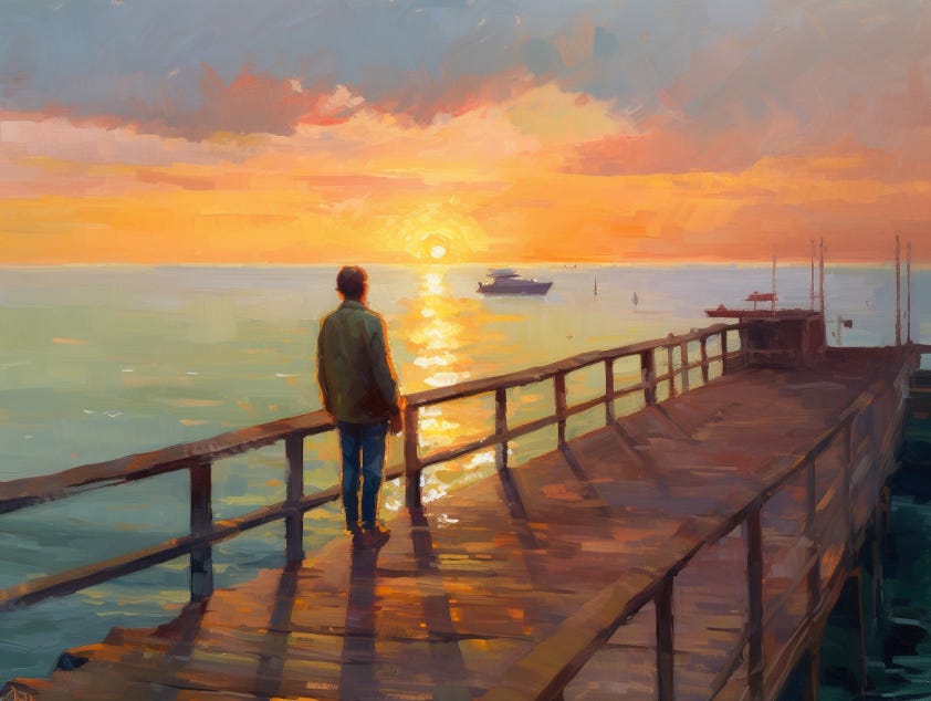 我坐在碼頭的石壆看著海面金光閃爍的晚霞,試圖紓緩心中希望燃燒起的亢奮。