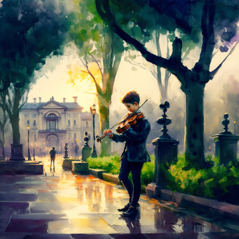 天邊泛起橙黃、藍和淺綠的彩霞,淡紅天空下十多隻海鷗在盤旋,數不完的雀鳥吱吱領着家眷穿梭回巢,公園遊 人幾乎都走光了,園外行人匆匆,該是放工趕着回家吧;但仍有不少人駐足聽一個小孩在拉小提琴。小孩正在拉着 Mozart的《月光曲》,稚氣的臉上掛着笑容,眼神稍微憂傷,圍觀的人感動得無以名狀。每逢有人扔硬幣到前面小提琴的空盒,他都會轉過身來微微頷首示意,剎那間他稚氣的臉上流露出成熟的自信,不協調的神色十分可愛。